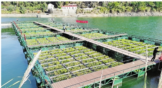 千岛湖首个正式推广的生态浮岛,长满翠绿的空心菜。