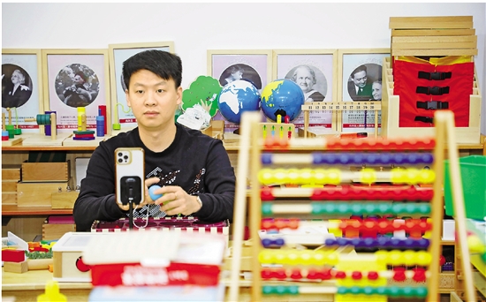 | 永嘉县桥下镇韩埠村是有名的电商直播村,村里有300多家生产教玩具的中小企业。该村村委会为帮助村民直播带货,专门开辟出村办公大楼的一层给村民免费使用。图为该村村民吴奔奔正在淘宝直播间销售自家的新品。今年“双十一”期间,他们的销售额提高了3倍左右。 本报记者 吕之遥 摄 |