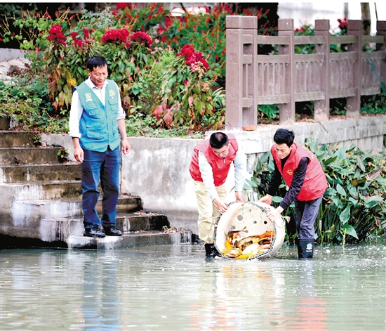 | 在长兴县和平镇长城村西大河,该村网格党员和清廉志愿者们正在放养锦鲤,用来净化水质,守护母亲河。近年来,和平镇坚持党建引领,创新推出互动式服务社会治理机制,通过党群互动服务体系,不断激发红色细胞活力,打造景美人和的新画卷。 许旭 摄 |