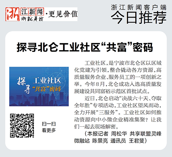 工业社区,是宁波市北仑区以区域化党建为引领,整合撬动各方资源,高质量服务企业、服务员工的一项创新之举。今年8月,北仑成功入选高质量发展建设共同富裕示范区首批试点。