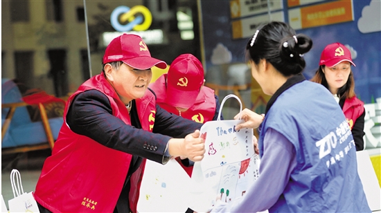 红领青年与党员一起为快递员送“爱心包” 蒋剑锋 摄