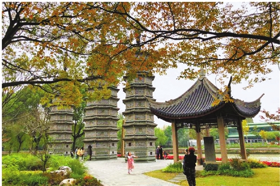 嘉兴南湖区 走进古运河嘉兴段的三塔公园,一片银杏树,二个石排坊,三座古砖塔,在银杏黄金叶的映衬下,更加美丽。 拍友 郑国祥 摄