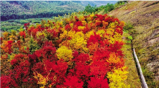 金华婺城 安地水库边的一排乌桕树染红了色彩,散发着浓浓秋意。 拍友 黄诗媛 摄