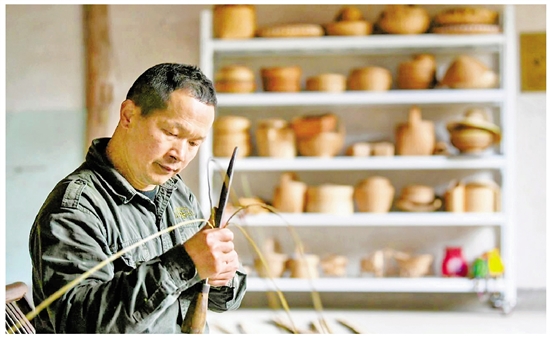 在编制前,潘云峰需要将整根毛竹通过十几道工序劈成一条条竹篾。