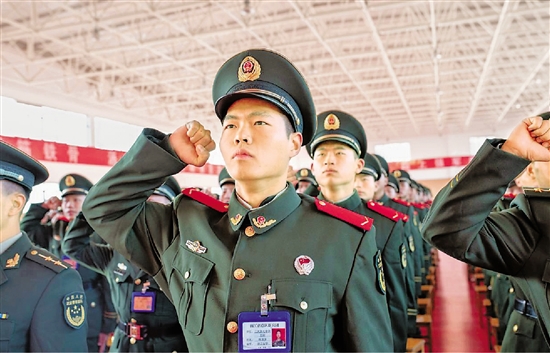 12月3日上午,武警浙江总队新兵团各新兵大队同步组织新兵授衔仪式。在武警浙江总队机动支队礼堂中,200余名新兵整齐列队,许下铿锵誓言。