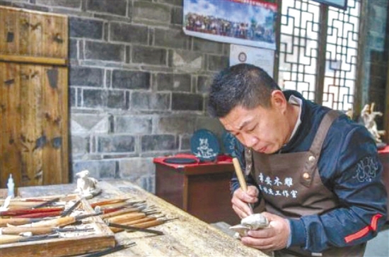 浙江台州“章安木雕”非遗传承人王林杰在章安老街上创作木雕 范宇斌 摄