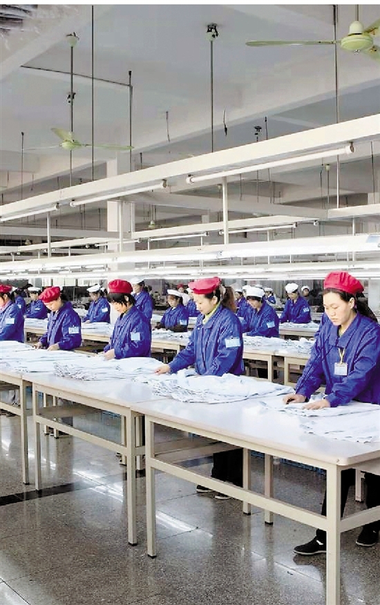 华城集团的车间里,工人正在进行服装整理。