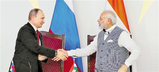 2016年10月15日,在印度果阿,俄罗斯总统普京(左)与印度总理莫迪在双方协议的签署仪式上握手(资料照片)。 新华社发