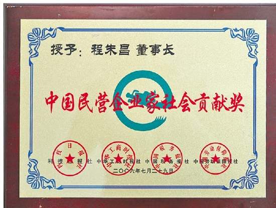 2006年7月,程朱昌被授予“中国民营企业家社会贡献奖”。
