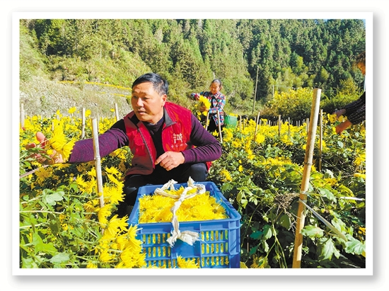 | 开化县积极引导村民因地制宜种植菊花、茶叶、中草药等经济作物,发展村集体经济,带动群众增收致富。图为近日,齐溪镇丰盈坦村村两委干部带领村民抓住晴好天气采收皇菊,田间地头一片繁忙。 汪鹏 摄 |