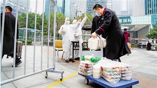 12月8日上午,在杭州钱江国际时代广场,工作人员正在将1500份爱心盒饭送进隔离点。盒饭菜品丰富,有多种口味供选择。 本报记者 李震宇 吕之遥 摄