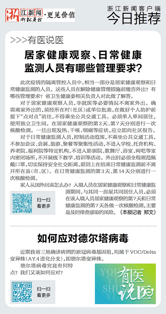 此次疫情的隔离管控人员中,相当一部分是居家健康观察和日常健康监测的人员。这些人员在解除健康管理措施前能否外出?有哪些管理要求?省卫生健康委相关负责人对此做了解答。