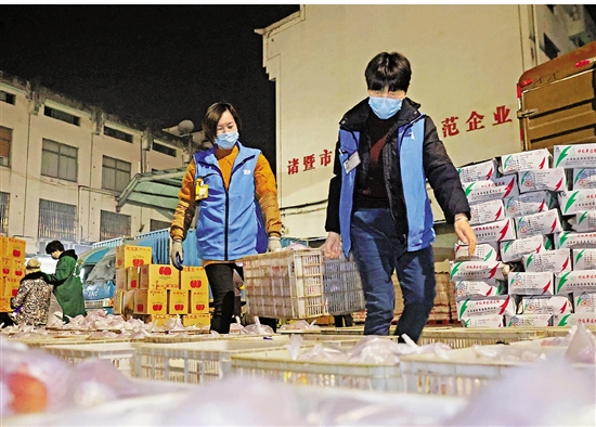 12月11日,诸暨市一百集团有限公司连夜召集员工调拨蔬菜、肉类等生活物资,统一装车支援上虞。