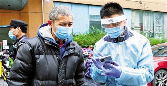 黄晓明(右)在街道核酸检测点指导居民查验是否有时空伴随。