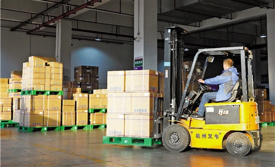 振德医疗物流部门加班加点保障物资运送。 共享联盟越城站 傅偲艺 摄