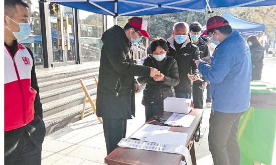 12月13日,工行诸暨支行青年员工组成志愿服务小队,投身全员核酸检测服务工作。 赵洁玲 摄