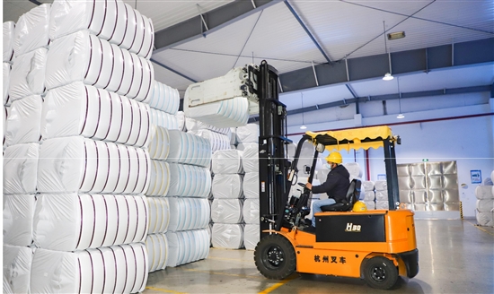 绍兴裕辰新材料有限公司内,工人正在搬运货物。 共享联盟上虞站 龚洁节 摄
