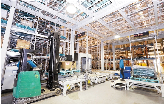 在德马科技集团股份有限公司的立体仓库内,工人正在对货物进行流水线自动存储。