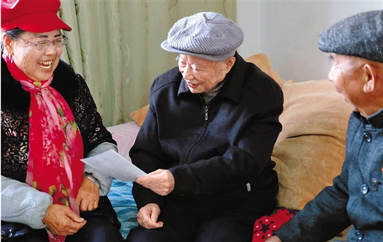 娄玉妹夫妇赶到嘉善看望另一位给她拍照的摄影师徐志烈(中)。如今,90岁的徐志烈腿脚有些不方便,但思路仍清晰,对往事如数家珍。