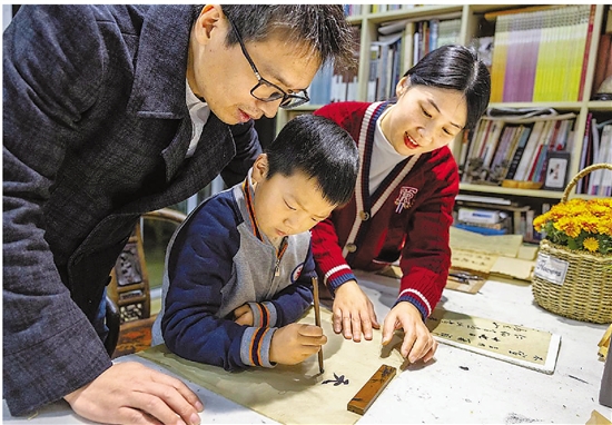 张宝祥的女儿正在教孩子练习书法。