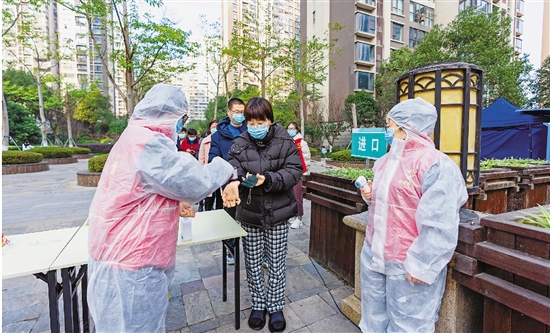 1月2日,新碶街道凌霄社区世茂·世界湾二期的居民申请成为志愿者,参与小区守小门、协助核酸检测采样、“扫楼”等防控工作。 本报记者 贺元凯 摄