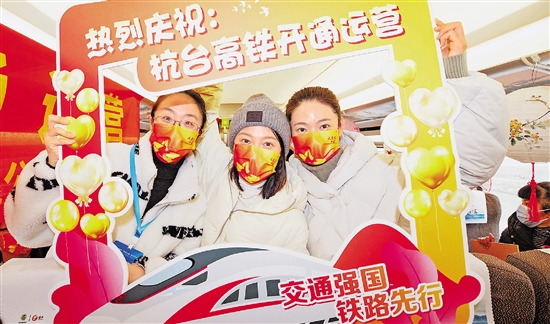 1月8日,杭台高铁嵊州新昌站首开至温岭的G9309次列车上,乘客在车厢里合影留念。 本报记者 郑培庚 摄