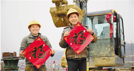 1月8日,桐庐县舞象山路道路建设工程项目工地,桐庐县摄影家协会的志愿者为项目建设者送福并留影。