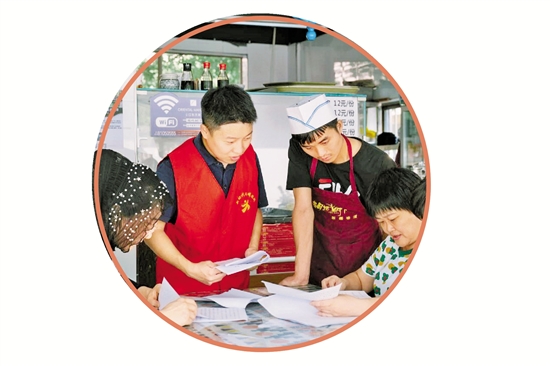 立法联络站工作人员在义乌网红街区樱花街向餐饮商户调研反食品浪费法草案意见。
