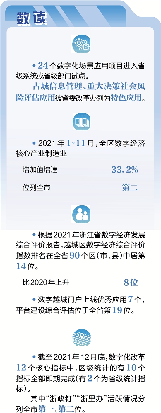 •截至2021年12月底,数字化改革12个核心指标中,区级统计的有10个指标全部即期完成(有2个为省级统计指标)。