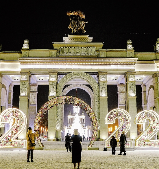 冬日,人们在莫斯科国民经济成就展览馆的“2022”灯饰前留影。 新华社发