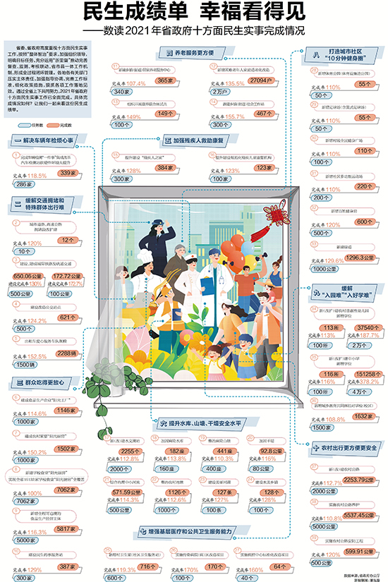省委、省政府高度重视十方面民生实事工作,按照“整体智治”要求,加强组织领导,明确目标任务,充分运用“浙里督”推动完善督查、监测、考核联动,省市县一体工作机制,形成全过程闭环管理。各地各有关部门压实主体责任,加强指导协调,完善工作标准,细化政策措施,狠抓各项工作落地见效。通过全省上下共同努力,2021年省政府十方面民生实事工作已全面完成。具体完成情况如何?让我们一起来看这份民生成绩单。