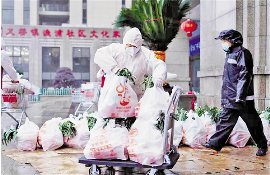 1月26日,义桥镇志愿者正在为御景蓝湾小区居民运送日常生活物资。