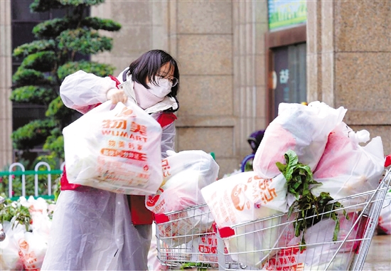 ②在萧山义桥御景蓝湾小区,志愿者正为封控区的居民运送物资。
