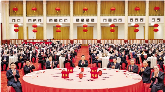 | 1月30日,中共中央、国务院在北京人民大会堂举行2022年春节团拜会。党和国家领导人习近平、李克强、栗战书、汪洋、王沪宁、赵乐际、韩正、王岐山等同首都各界人士欢聚一堂,共迎新春。 新华社记者 黄敬文 摄 |