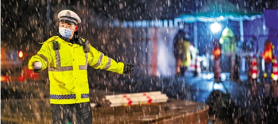 2月2日晚,杭州西湖区与富阳区交界的金家岭卡口,交警顶风冒雪执行疫情防控任务。 本报记者 董旭明 摄