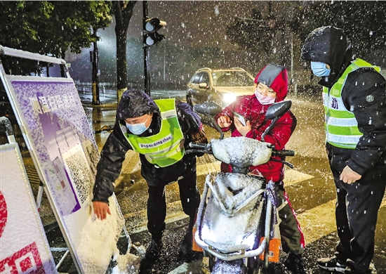 2月2日晚,杭州市富阳区东洲街道紫铜村卡口上,党员干部用手擦干净属地码上的积雪,方便进村群众扫码。