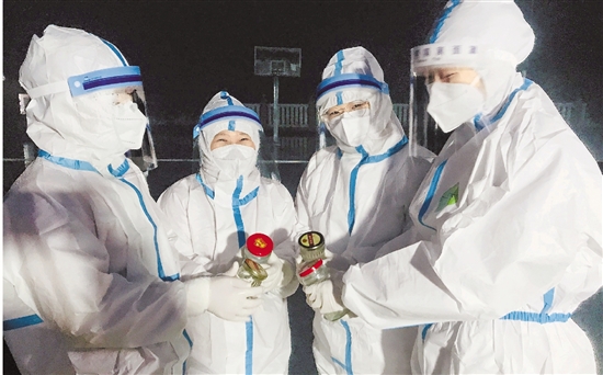 杭州市富阳区洞桥镇贤德村管控区核酸检测现场,村民用家里囤积的调味品玻璃罐装满热水,让防控人员取暖。 拍友 项轶帆 摄