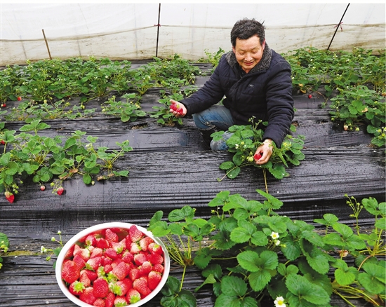 2月5日,杭州市临安区天目山镇农业基地内,农民在采摘草莓。