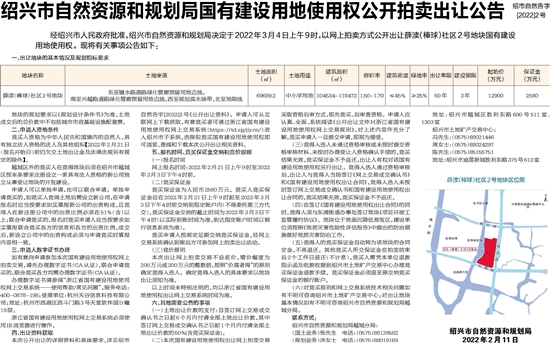 经绍兴市人民政府批准,绍兴市自然资源和规划局决定于2022年3月4日上午9时,以网上拍卖方式公开出让薛渎(棒球)社区2号地块国有建设用地使用权。现将有关事项公告如下: