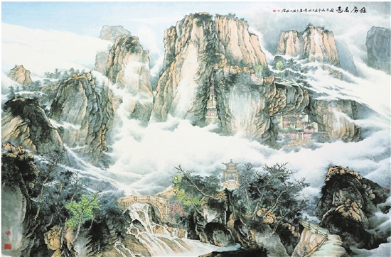 画的超越源于心的超越,茹峰的作品这样诉说着。无论是崇山峻岭、浮云奔泉,还是杂树茅舍,茹峰都作了新的整合、编排,赋传统的题材以新的神采。 茹峰张扬了古已有之的“吹云弹雪”法,泼彩吹拂,寓人工于天成,把尽兴流淌的粉彩变成富有灵性的流云霞光,犹如温顺的精灵偎依在葱郁的山峦之间,刚柔相济,动静对应,冷寂的表象下跃动着生命的脉搏。这里不含玄妙的禅机,这里没有老庄的超然,这里是茹峰构筑的一个属于他自己的语境,一则倾泻人世感怀的茹峰式的山林情话。 (刘国辉) |