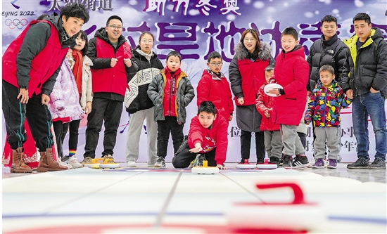 2月11日,长兴县太湖街道杨湾居民区举行乡村旱地冰壶赛,当地群众学习冰壶运动知识和得分技巧,在家门口感受冰壶运动的魅力。