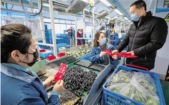 15日,宁波市海曙区高桥镇的金氏实业有限公司生产车间里,工人们正在加紧生产。从正月初十开始,回家探亲的员工基本到岗,企业还为一线车间的每位员工分发了现金红包。 本报记者 贺元凯 共享联盟海曙站 张昊桦 王微 摄