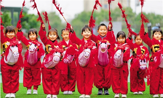 2月15日,长兴县开发区实验幼儿园的孩子们在展示传统非遗项目“下箬马灯”。