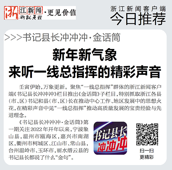 壬寅伊始,万象更新。聚焦“一线总指挥”群体的浙江新闻客户端《书记县长冲冲冲》栏目推出《金话筒》子栏目,特别抓取浙江各县(市、区)书记和县(市、区)长在推动中心工作、地区发展中的思想火花,在精彩声音中见“一线总指挥”推动高质量发展的宝贵经验与先进理念。