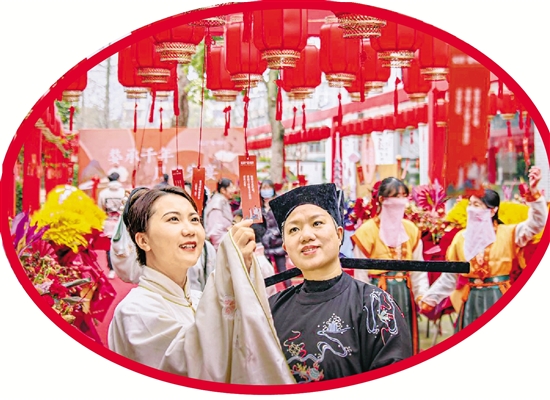 2月15日,在金华婺城,市民穿宋服、读宋词、猜灯谜。