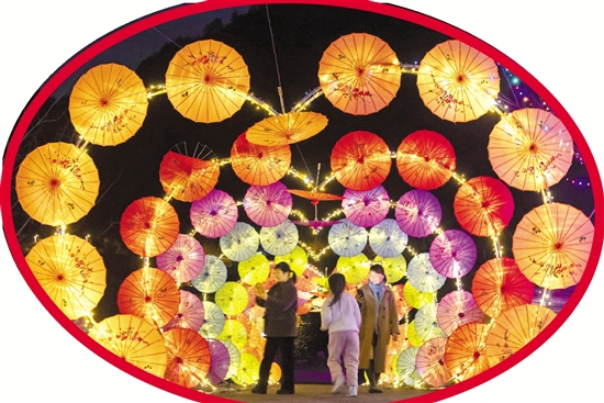 2月15日,景宁畲族自治县大均乡大均村游客赏灯。