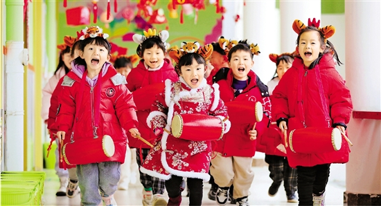 ↑ 2月16日,春季开学第一天,湖州市德清县钟管镇干山中心幼儿园的小朋友打起腰鼓、小堂鼓,迎接开学。 拍友 王正 摄