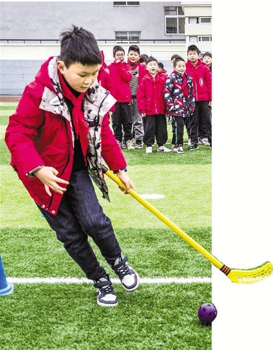 2月16日,开学第一天,仙居县第七小学开展“欢乐开学庆奥运”系列活动。图为学生正在体验旱地冰球运动。 拍友 陈月明 王瑶 摄
