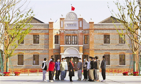 石燕青在1:1复建的1921年时期的嘉兴火车站站房为参观团队讲解。
