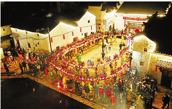 2月20日,农历正月二十,在建德市上吴方村,近百节板凳龙穿村绕庄游行。这是该村正月二十舞龙灯的节庆传统民俗。 本报记者 周旭辉 拍友 韩冰 摄